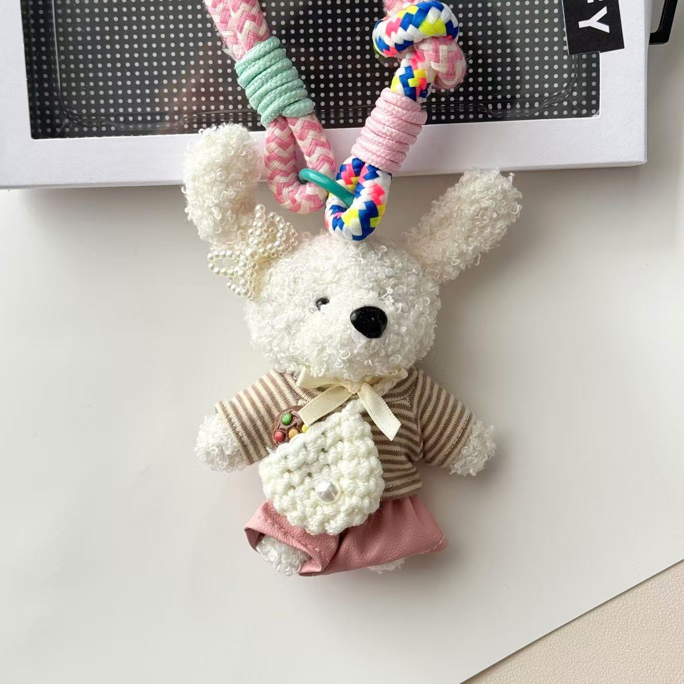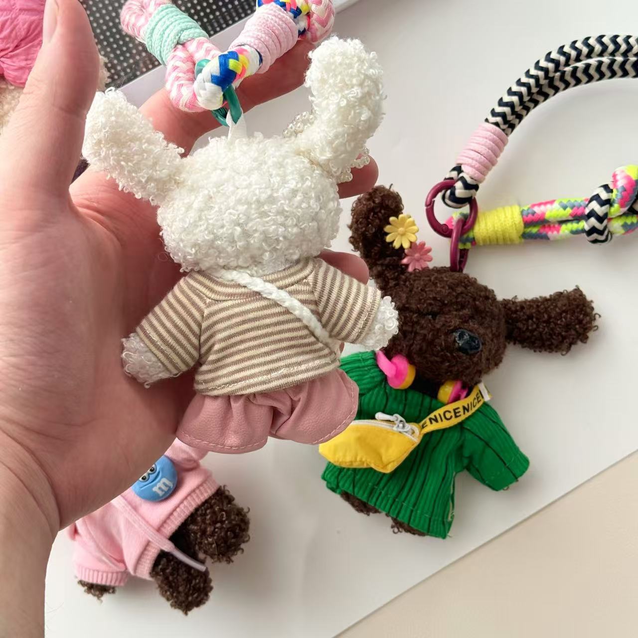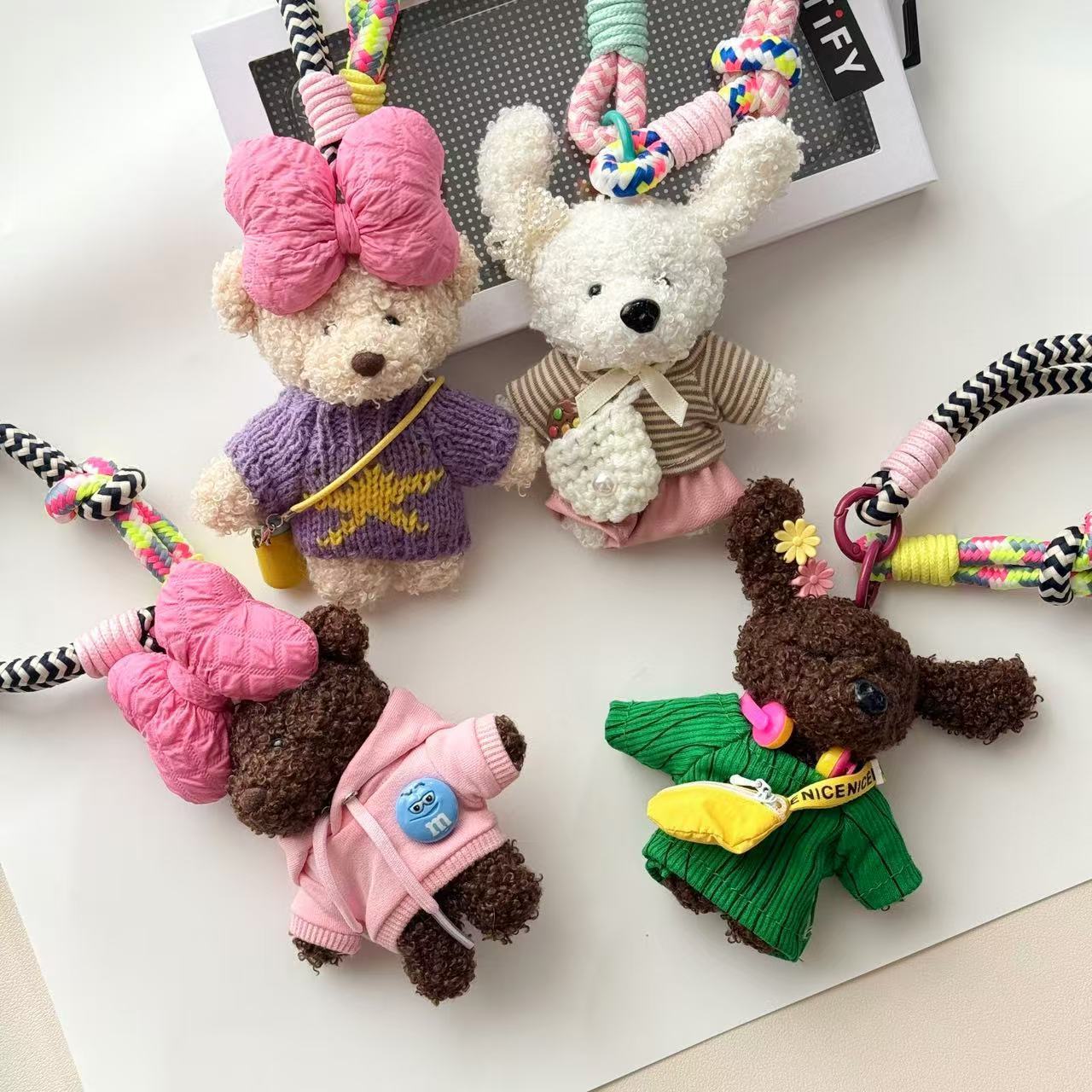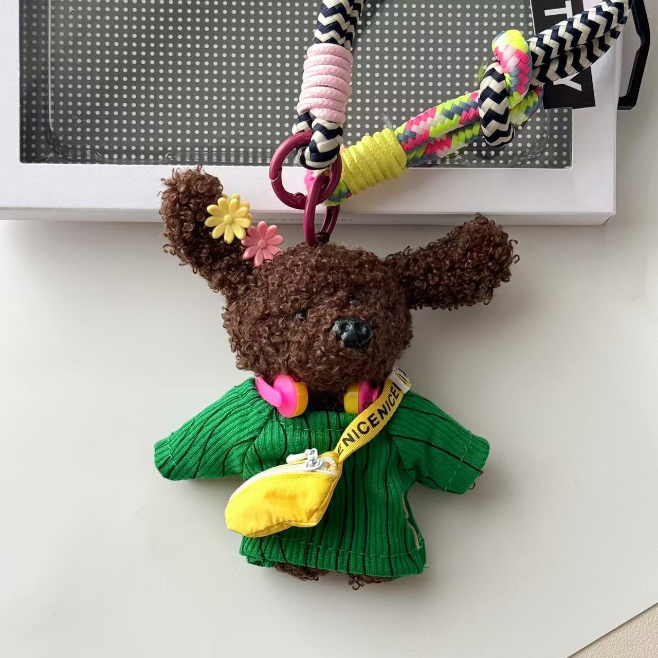 Color: five-pointed star sweater, backpack stripes, pink sweatshirt, green costume waist bag