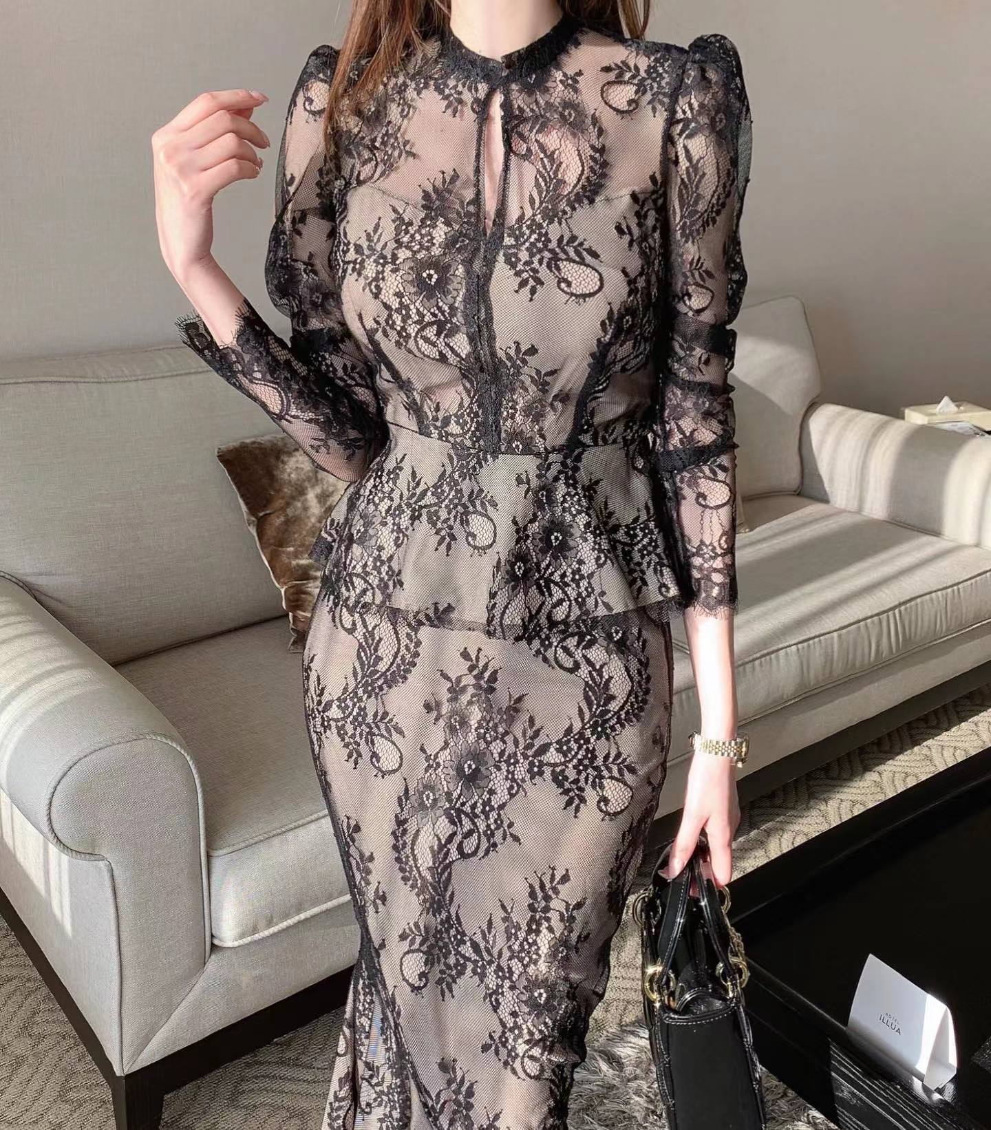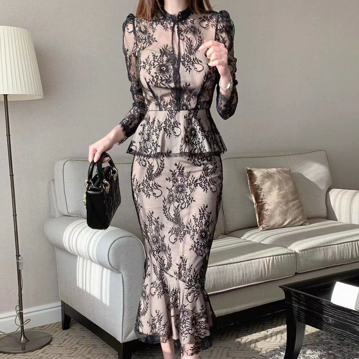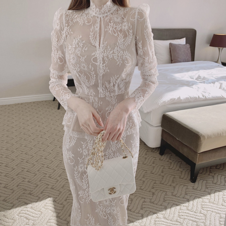 1 review for Graceful Stand Collar Hollow Lace Crocheted Design Shirt Ruffled Fishtail Hip Skirt