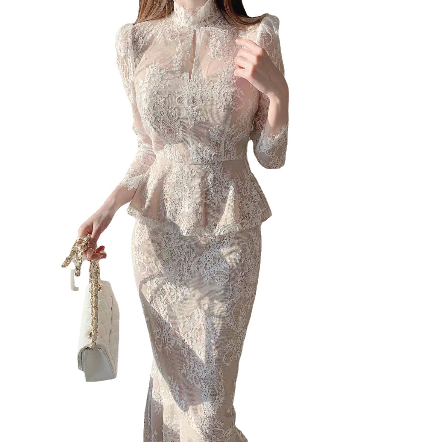 Graceful Stand Collar Hollow Lace Crocheted Design Shirt Ruffled Fishtail Hip Skirt
