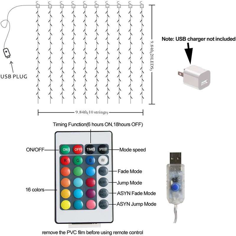 Specifications: 3M*1M (100 lights) USB models, 3M*2M (200 lights) USB models, 3M*3M (300 lights) USB models