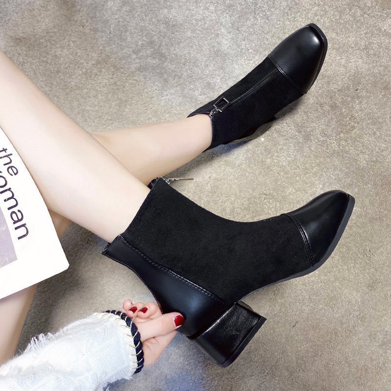 Womens Fashionable Mid-Heel Ankle Boots With Front Zipper