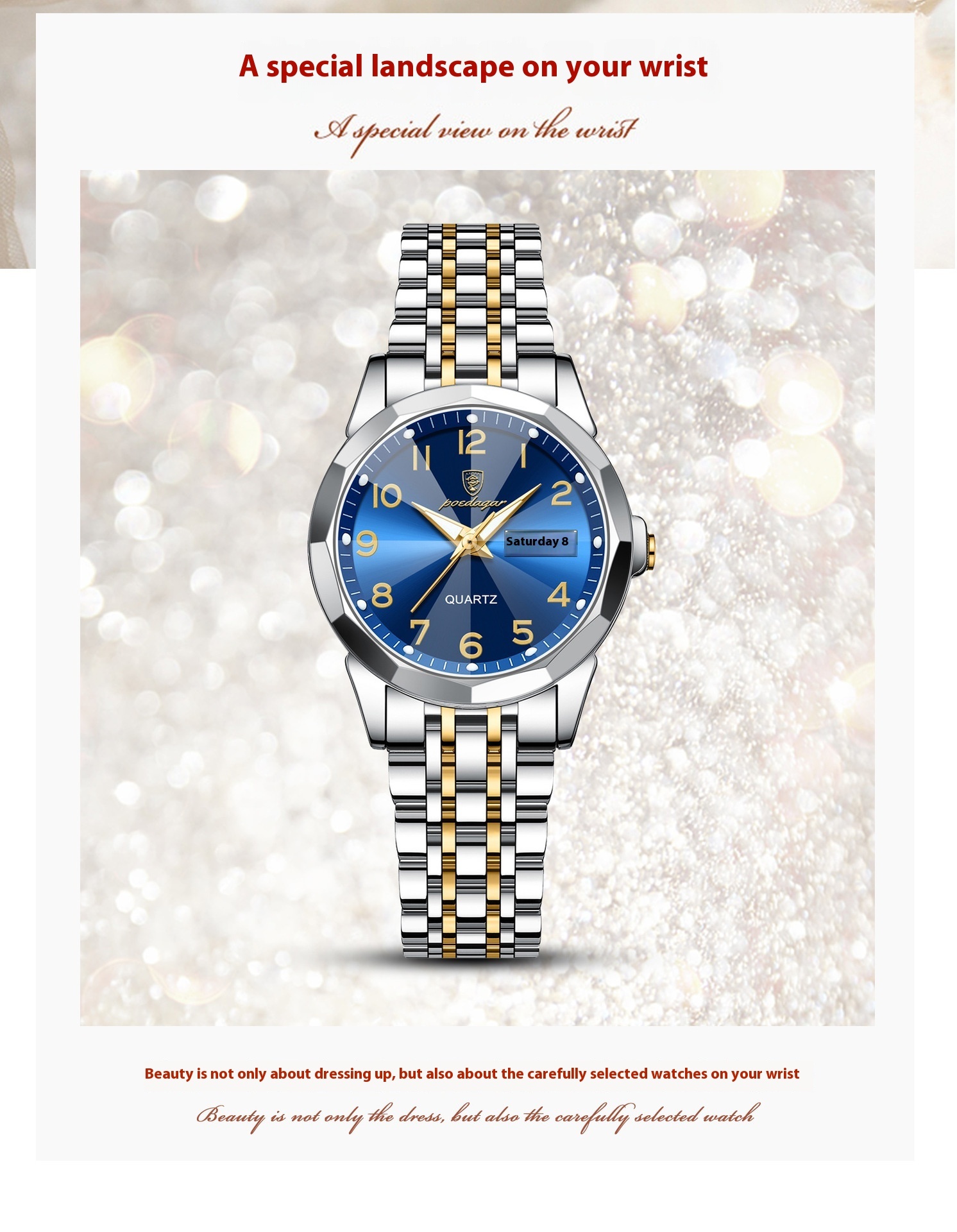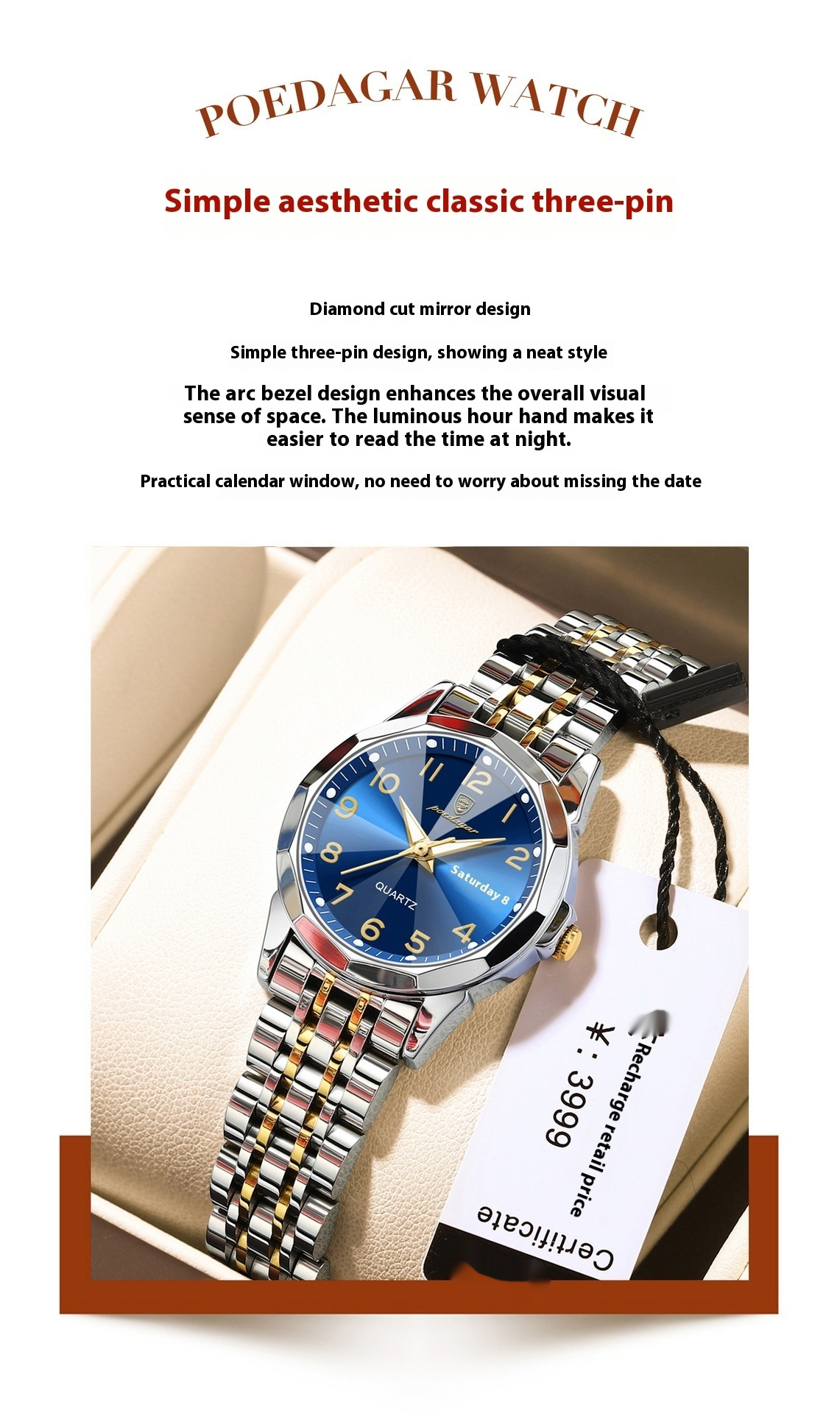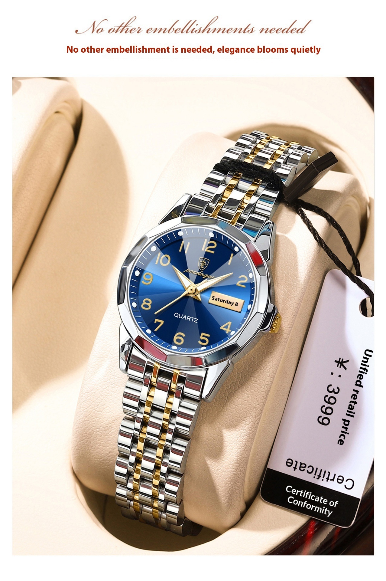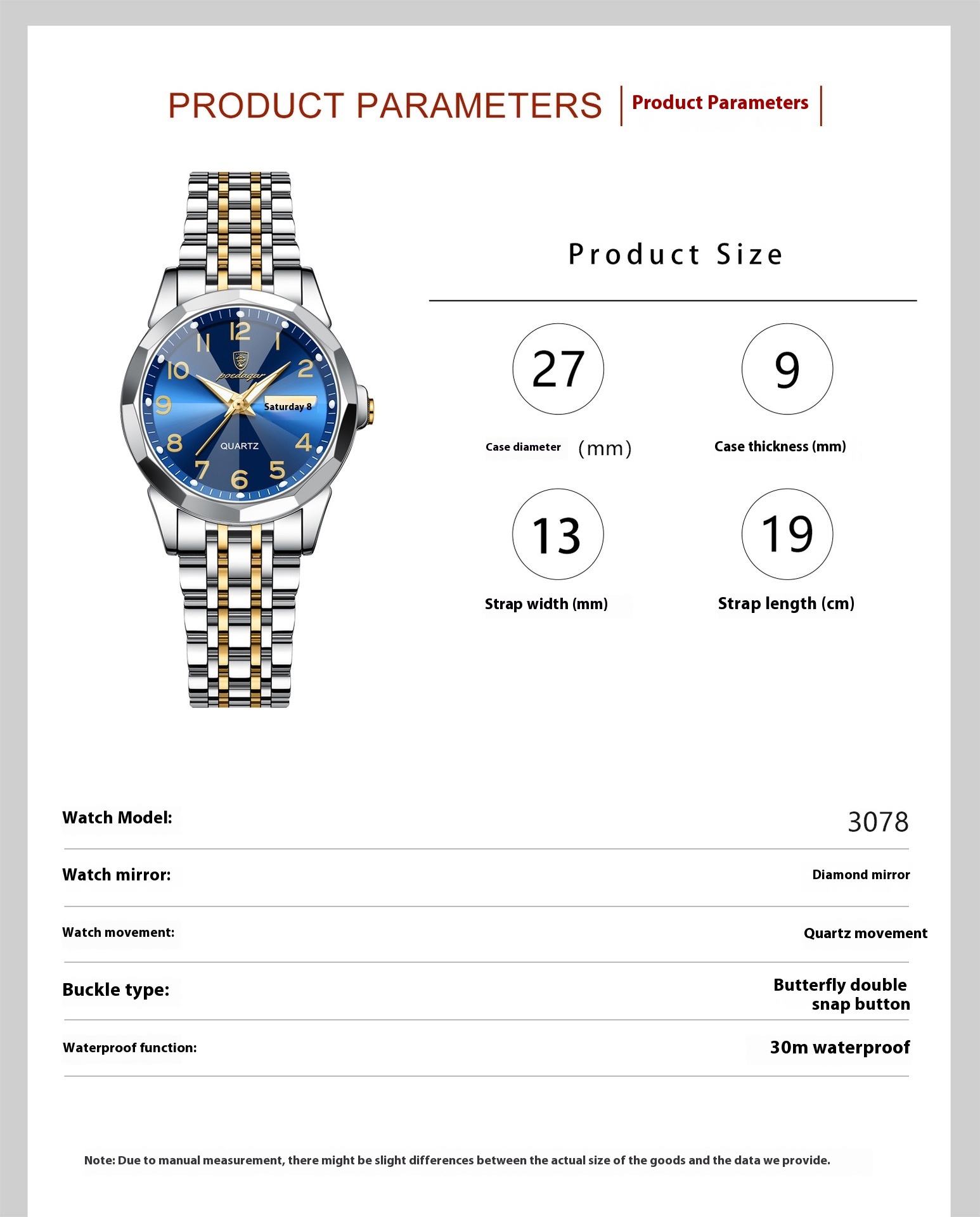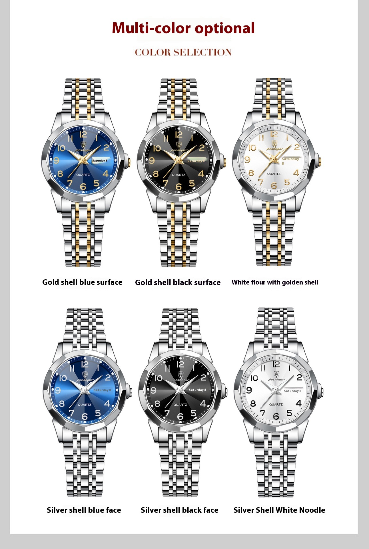 Color: 3078 gold and blue surface steel belts, 3078 gold and white surface steel belts, 3078 gold and black surface steel belts, 3078 silver case blue surface steel belts, 3078 silver case white surface steel belts, 3078 silver case black surface steel belt