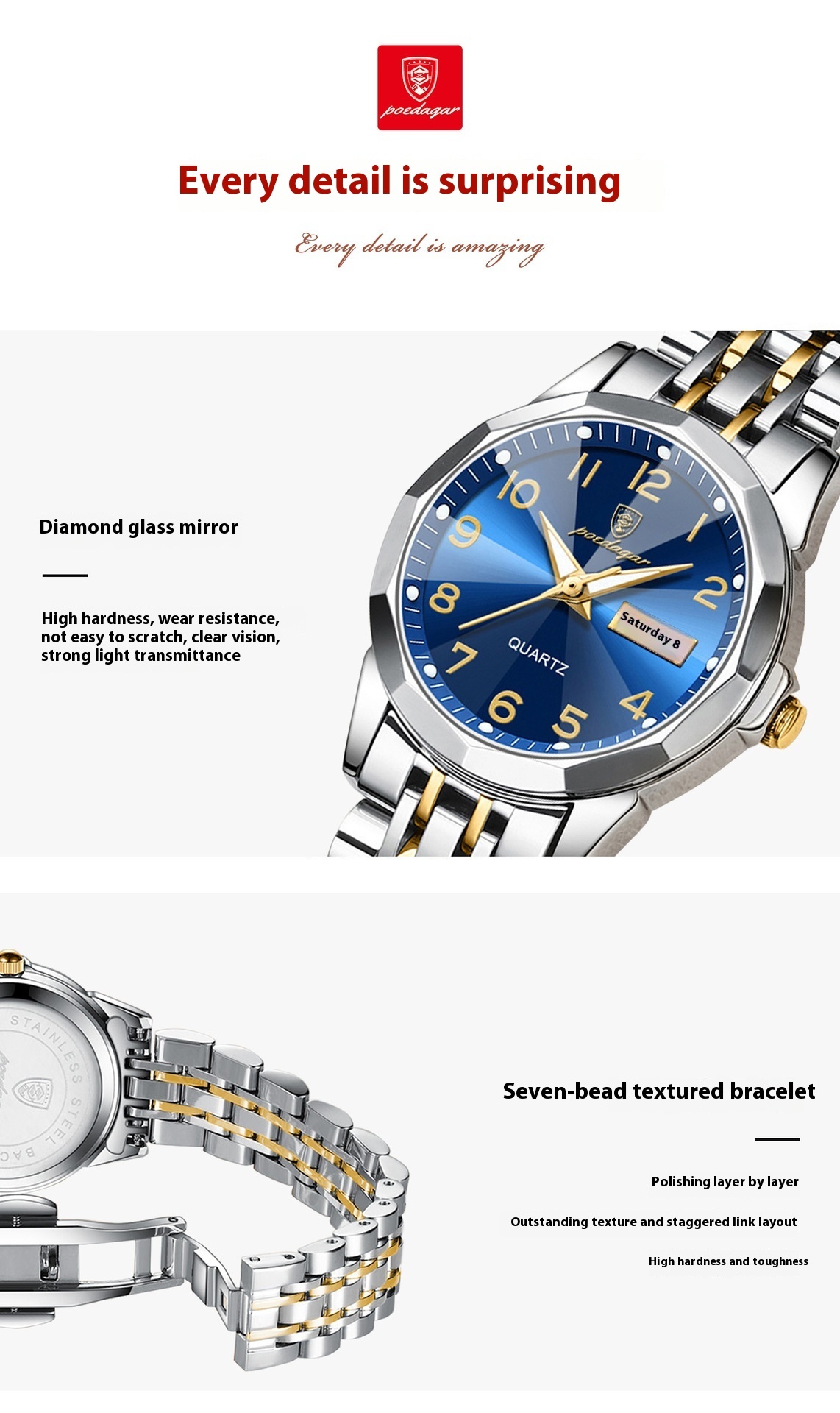 Buena calidad. Igual a la foto. Espero que la maquinaria y el acero de la caja y pulsera sea duradero.
